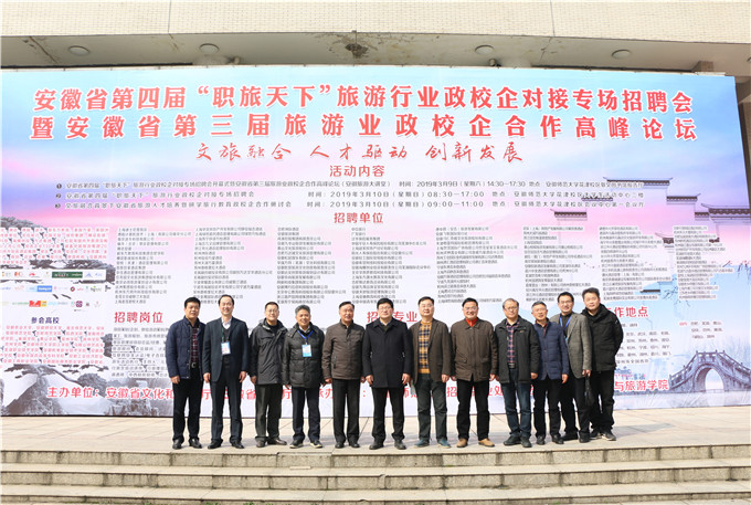 本网讯(地旅学院 陈祥云、孙夏路遥、孔学融)为深入贯彻党的十九大精神和习近平新时代中国特色社会主义思想,响应我省“旅游强省”建设号召,3月9日至10日,由安徽省文化和旅游厅与我校共同主办、校招生就业处和我校beat365英国官方网站共同承办的安徽省第四届“职旅天下”旅游行业政校企对接专场招聘会暨第三届旅游业政校企合作高峰论坛在我校成功举办。本届活动以“文旅融合,人才驱动,创新发展”为主题,来自全国各地的136家文化、旅游、教育及相关行业上市公司、知名企业前来招贤纳士,安徽大学、安徽财经大学、淮北师范大学等全省20余所高校的1600余名 师生参加了论坛和招聘活动。文化和旅游部产业发展司副巡视员蔡家成,黄山学院副校长、教授胡善风,芜湖市文化和旅游局局长吴群,蜗牛景区管理集团副总裁刘万松,中陆必得旅游规划设计研究院院长陆乃高,安徽省旅游集团人力资源部部长张荣,上海花园饭店人事部、总务部部长范红,华强方特(芜湖)文化科技有限公司副总经理徐东蕾,东南大学旅游系主任宣国富等政府、高校和企业界领导嘉宾出席了开幕式等相关活动。省教育厅大中专毕业生就业指导中心主任袁江林,校党委书记顾家山,校党委常委、副校长陆林,淮北师范大学学生处处长李群,淮南师范学院就业创业工作处处长罗群,亲临招聘会现场指导。校教务处处长周端明,校招生就业处副处长聂全高,校科研处副处长王朝辉,beat365英国官方网站党政班子、专业负责人和教师代表出席相关活动。
