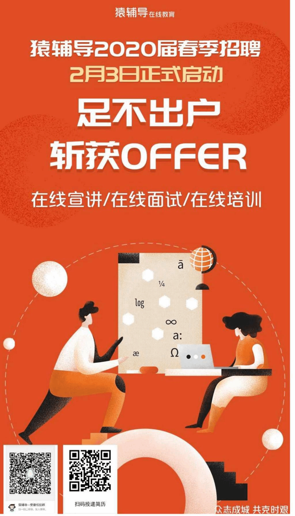 猿辅导公司是国内领先的K12在线教育互联网公司,截止2018年,已完成E+轮(3亿美金)融资,是首个估值超过30亿美元的独角兽企业。旗下拥有猿辅导、 猿题库、小猿搜题及斑马系列产品,粉笔公考等兄弟产品。